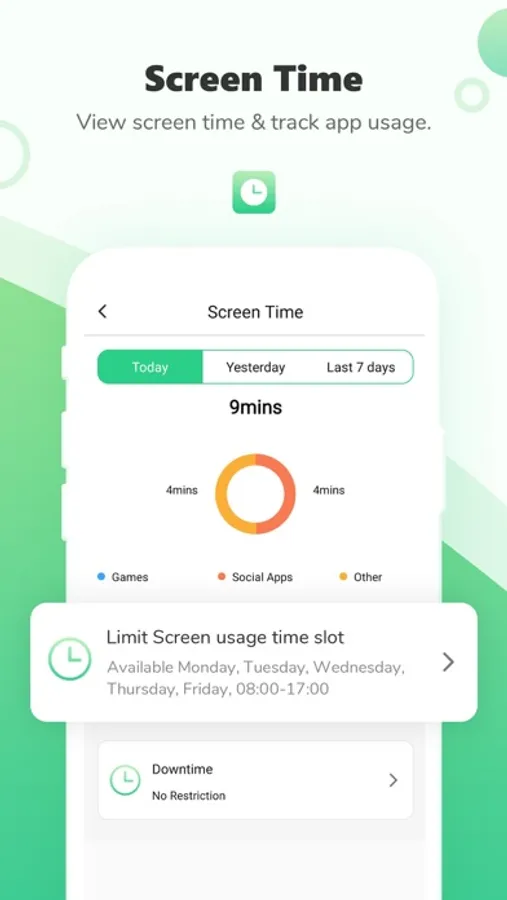 - Control daily or weekly maximum time that kids spend on certain app or smartphone