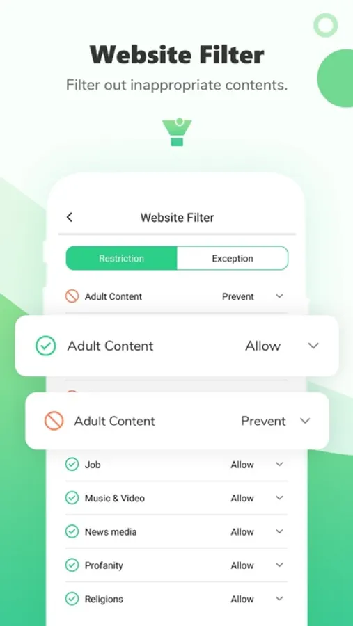 - One-click to block adult, violence, gaming, gamble and more unwanted websites by categories
