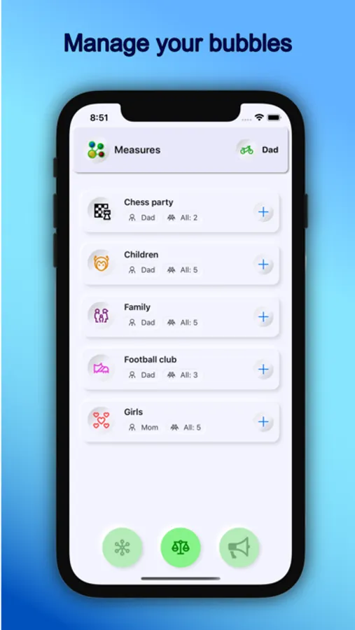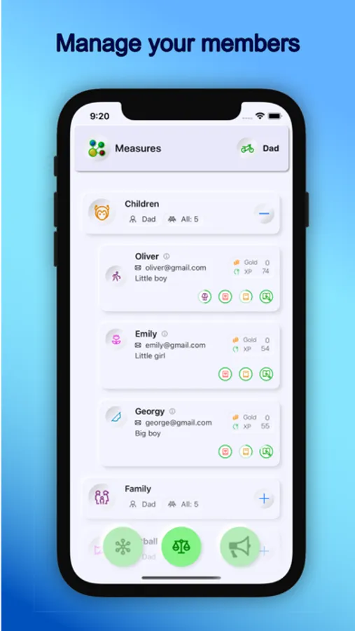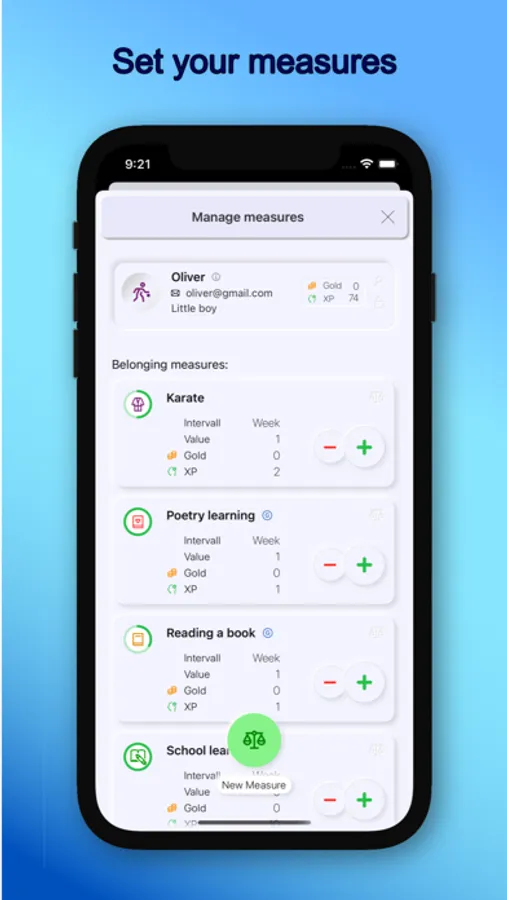 ParentKit is a group measure and motivation tool. We can create groups (e.g. family, children, soccer team, photo club,…), add members to the groups, create measures (e.g. training, learning, watching TV, personal projects,…), and link these measures to our groups or group members. This way we can continuously follow up members’ status in the particular targets, tasks and competitions. We can see our measurements at a glance, but also look into the details on graphs. We can compare the group members’ results and announce winners e.g. on a weekly basis.
