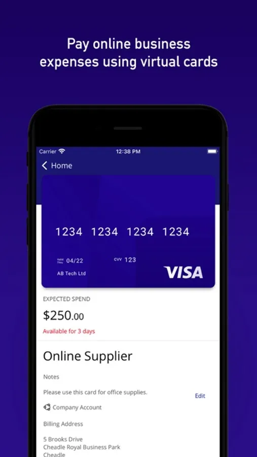 With Visa Commercial Pay, virtual cards can be securely created or requested in accordance with your company’s pre-defined policies. Push notifications immediately notify finance managers or approvers of new virtual card requests. Once approved, virtual cards are sent directly to your mobile device.