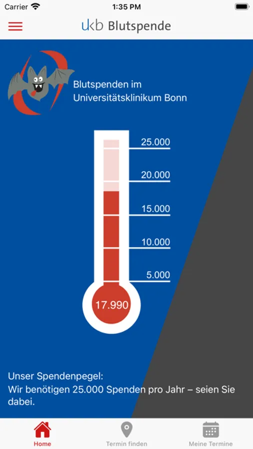 Blutspendepegel: Der Blutspendepegel zeigt an, wie viele Blutspenden jährlich zur Versorgung der Patienten im Universitätsklinikum Bonn und einiger Krankenhäuser in der Region Bonn Rhein-Sieg benötigt werden und viele Menschen bereits gespendet haben.