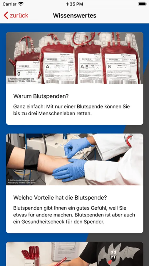FAQs: Möchten Sie wissen, warum Blutspenden so wichtig ist oder wie eine Blutspende abläuft? In der App finden Sie die Antworten auf die häufigsten Fragen rund um die Blutspende.