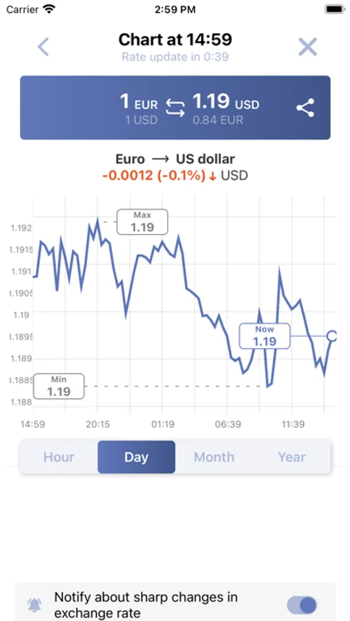 • Real-time chart of the exchange rate of any pair of currencies for the last hour, day, month and for the year.