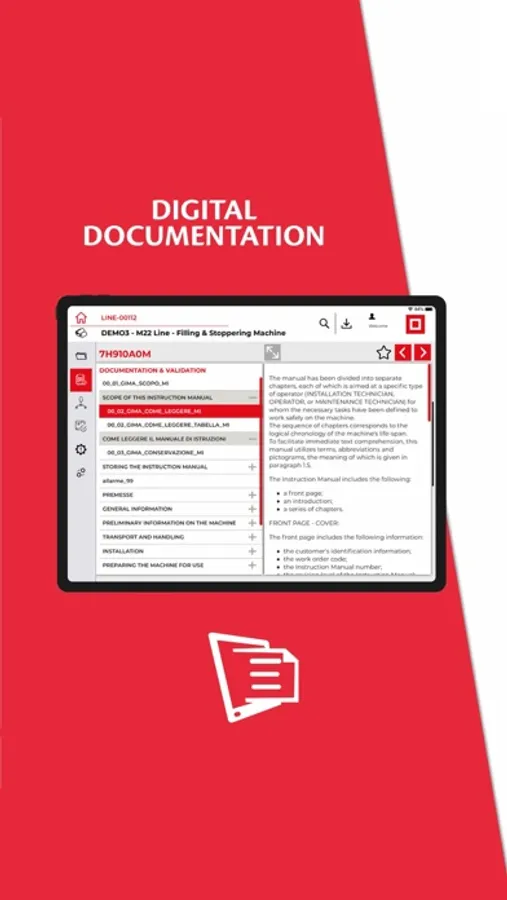 • Navigate the systems in 3D mode to access the individual sections • Create spare parts lists to be exported via email • Upload notes, photos, files and videos to enrich the history of the machine or line • Save to favorites useful documentation or searches through keywords