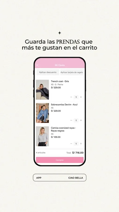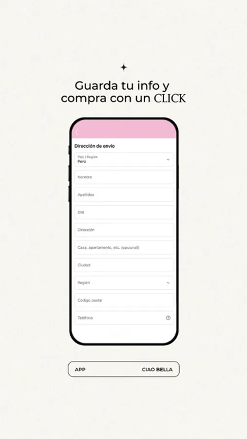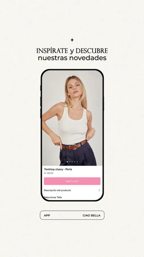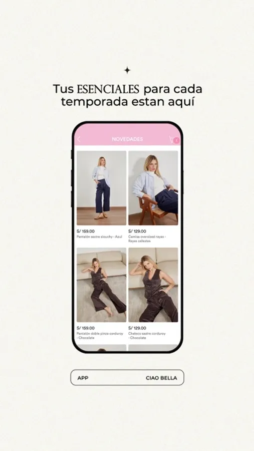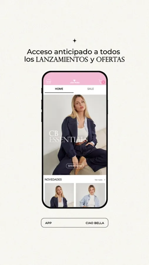 Descarga la nueva App de Ciao Bella y compra, navega y revisa todos nuestros lanzamientos más fácil y cómodamente desde tu celular.