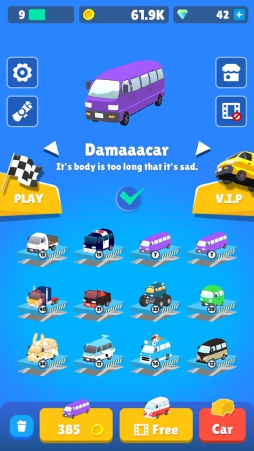 V.I.P membership is a weekly subscription product for $5.99. If you start the subscription, the following benefits will be available.30 Gems every day, doubled amount of play reward, access to every V.I.P cars currently updated, and no more autoplay ADs.