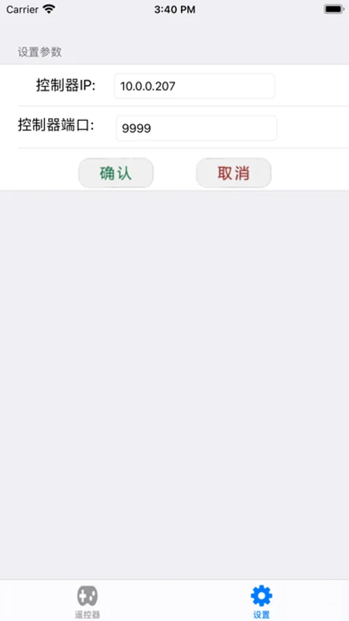 第二个界面是设置界面,用来输入用来与iPad或IPhone通信的检定自动控制器的IP地址和UDP端口。