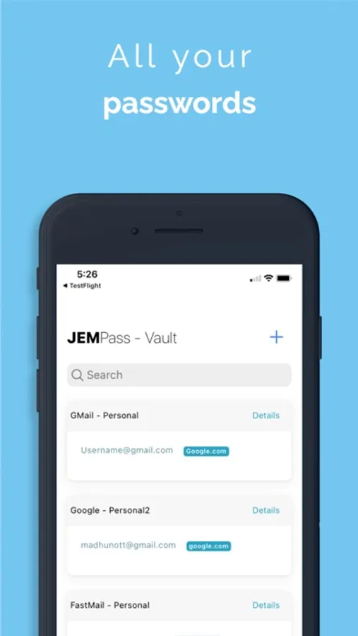 JEMPass data is always and seamlessly synced and usable across all your Apple devices — regardless of the iCloud account — as well as other devices you may use, such as devices running Windows, and in Chrome, Edge and Firefox.