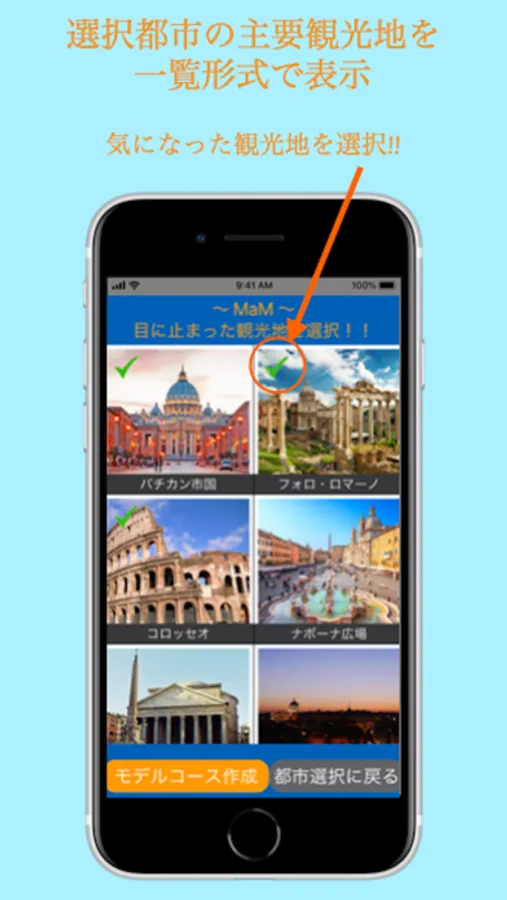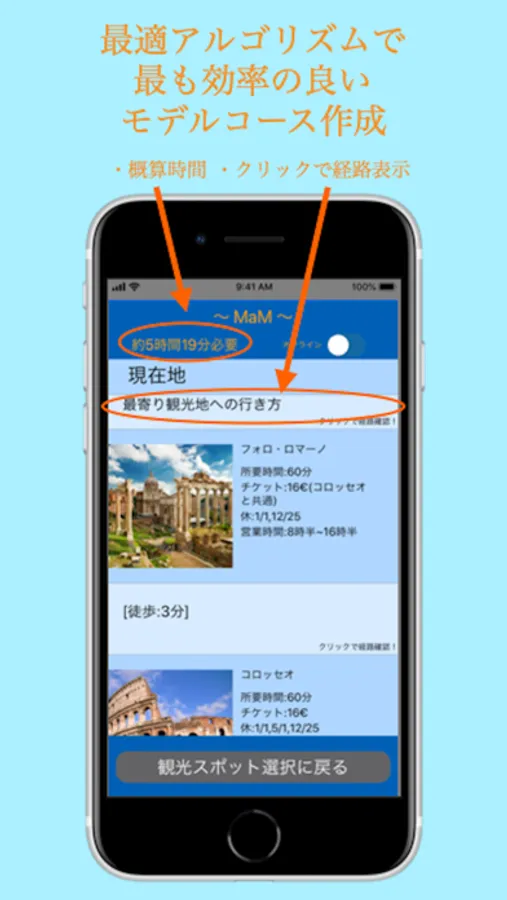 旅行時にオフラインでも最適アルゴリズムを用いて最も効率の良い観光地のモデルコースをご提供します。