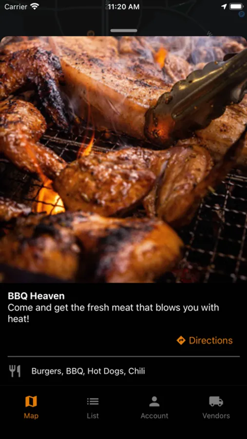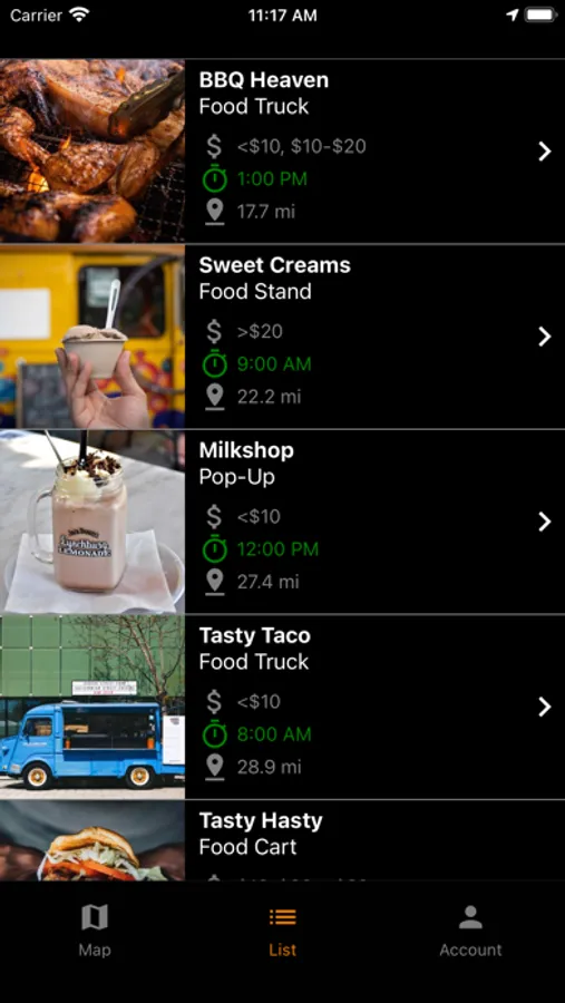 See food trucks in LA live on a map or in a list ordered by distance to your location. Select open food trucks to see the details and/or set the navigation for it.