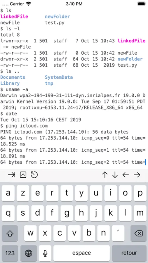 a-Shell mini is a complete local terminal emulator, allowing to run most Unix commands on you iOS device. You can transfer files using scp and curl, edit them with vim and ed, process them using grep, awk and sed. Work with git repositories using lg2.