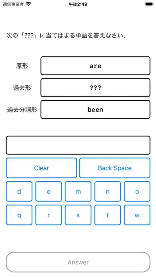 このアプリは、あなたが不規則動詞を覚え、英語の学習が進むことを助けます。入力式で問題を出題することにより、スペルを正確に覚えることを目指します。