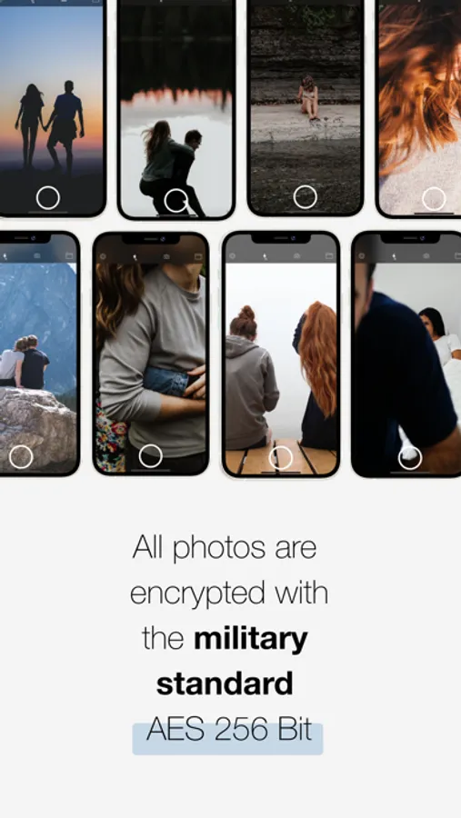 PrivCamera provides you the highest level of encryption – 256 Bit AES – the same encryption standard is used by government and military. Every captured image is protected with password after the photo is taken.