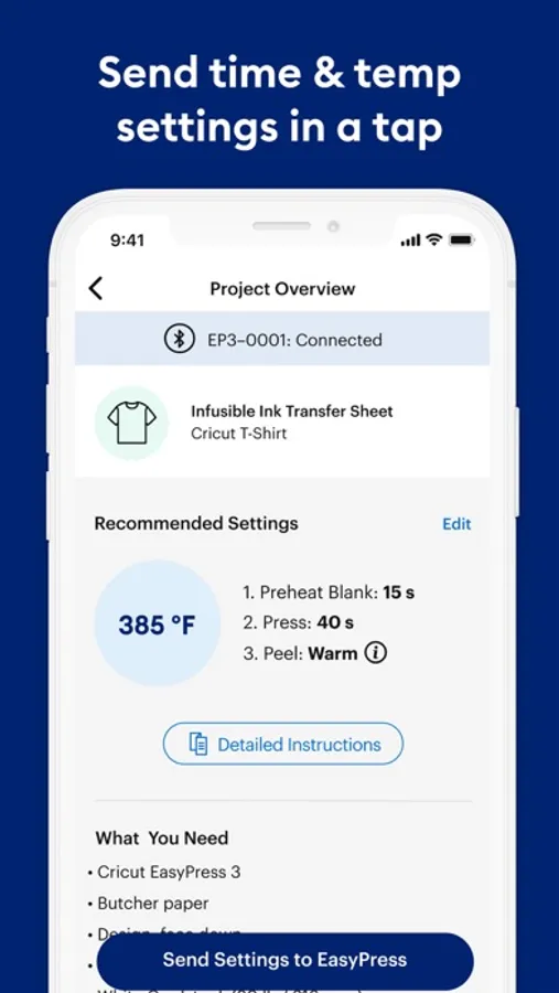 Get ideal time and temperature settings for virtually any heat transfer (HTV) project – and send them right to your press in a tap – with this companion app for Cricut EasyPress® 3 and Cricut Hat Press™ smart heat press.