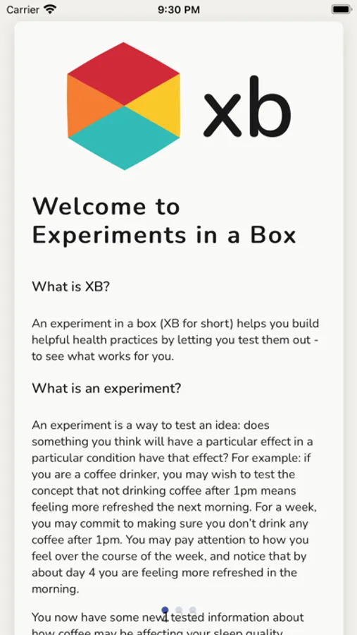 WHAT IS AN EXPERIMENT IN A BOX? An experiment is a way to test an idea: does something you think will have a particular effect in a particular condition have that effect? For example: if you are a coffee drinker, you may wish to test the concept that not drinking coffee after 1pm means feeling more refreshed the next morning. For a week, you may commit to making sure you don’t drink any coffee after 1pm. You may pay attention to how you feel over the course of the week, and notice that by about day 4 you are feeling more refreshed in the morning.