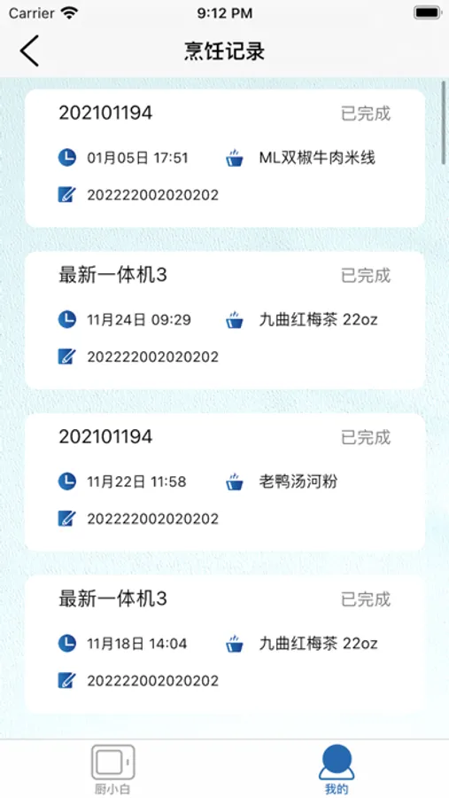 通过手机APP实现对烹饪-茶饮一体机、净水器、冰柜、极简款烹饪机的控制,进而实现对食品的烹饪加工以及设备的控制,查看设备的状态以及操作记录。