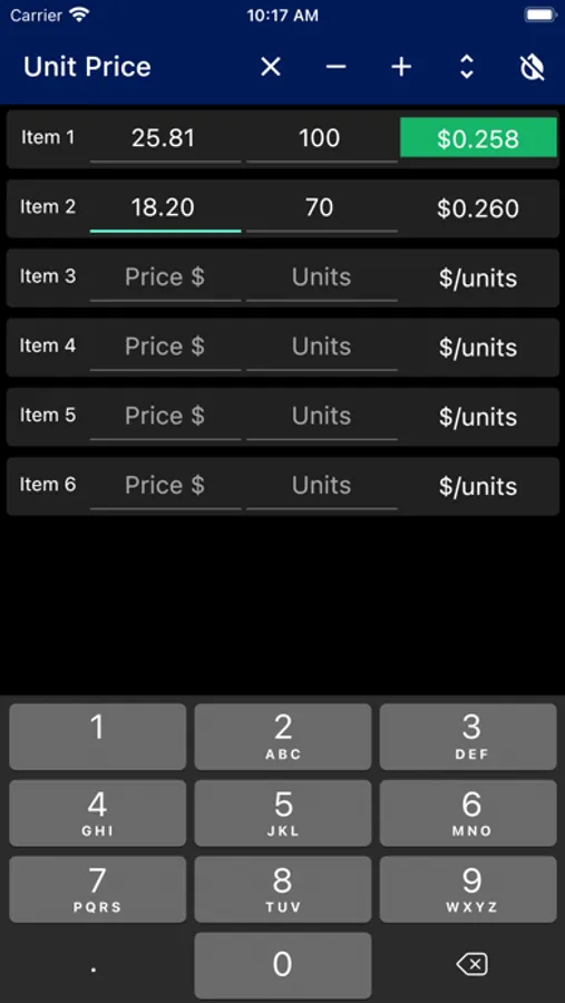 This app is fast because it's dead simple: just type two numbers and you're done. To use the app, just enter the price of the item and the number of units (oz, lbs, number in package, etc). It will calculate the unit price and highlight the best price as soon as the numbers are entered. There are fields for the quantity, name of each item and the name of each item's units, but they're optional.