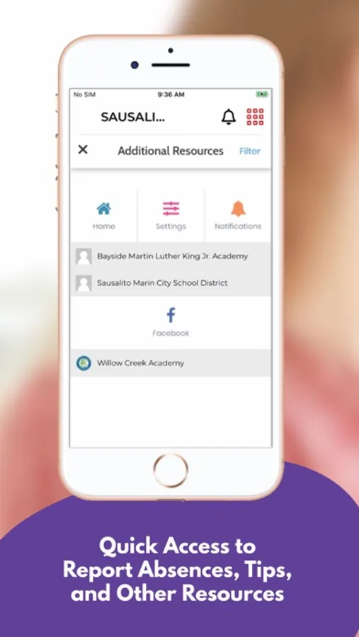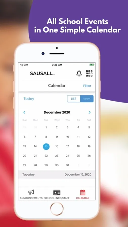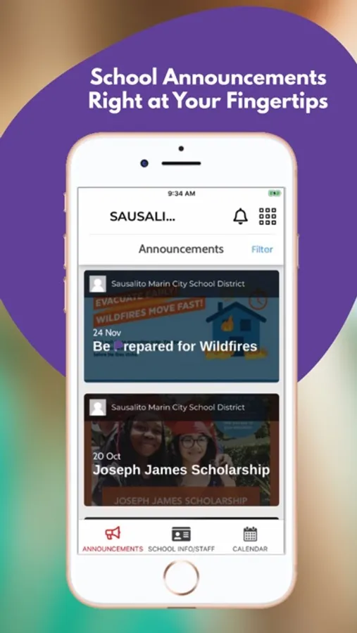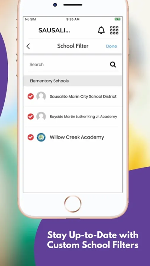The app includes information for the district and all schools. Filter by the school your child attends to feature information for that school.