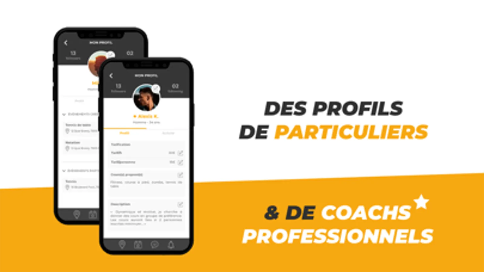 - Tu peux consulter tous tes événements en cours, à venir et passés, t'abonner à des profils qui t'intéressent, échanger avec eux, visualiser les sportifs autour de toi et créer des affinités selon vos intérêts intéressés.