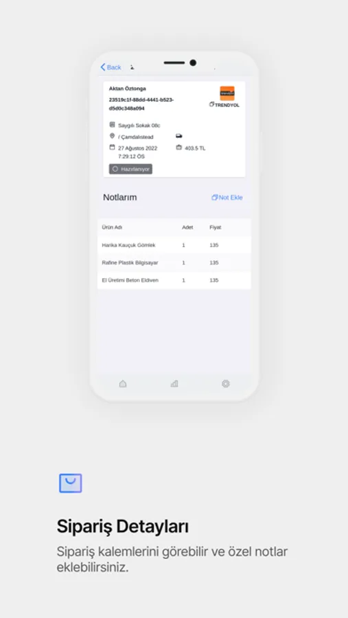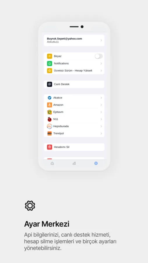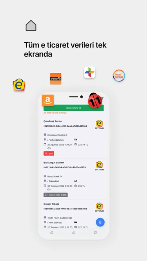 E-Ticaret mağazalarınızdaki siparişlerinizi tek ekrandan kolayca takip edebilirsiniz. Ideasoft , Gittigidiyor, N11, Hepsiburada, Amazon, Akakçe, Trendyol, EPTTAVM platformlarındaki pazar yerlerinize gelen siparişlerinizi ve detaylarını kolayca listeleyip görüntüleyebilirsiniz. Size kolay takip imkanı sağlayan tamamen ücretsiz bir E-Ticaret Sipariş Takip uygulamasıdır. Kolayca api bilgilerinizle entegre edip siparişlerinizi tek platform dan takip edebilirsiniz.