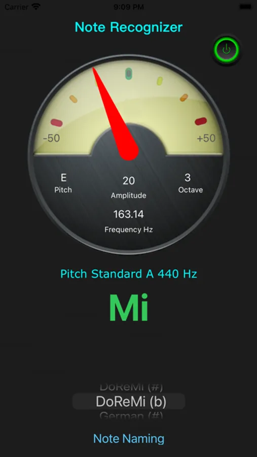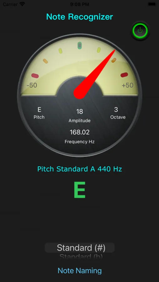 The Note Recognizer analyses the pitch frequency that you sing or play, and gives the corresponding note name. Very useful for singers who need to find the right starting note of a song. Or if you want to know the key of a song; sing the tonic, and you get the note name of the key. Also great as a tuner for guitar, or checking your intonation on flute, violin or any instrument.