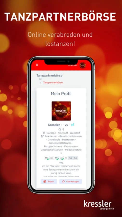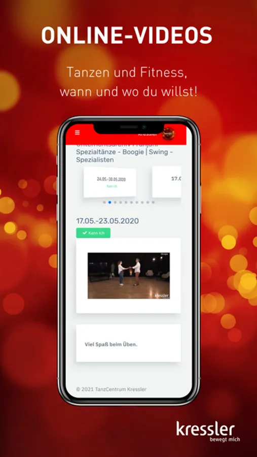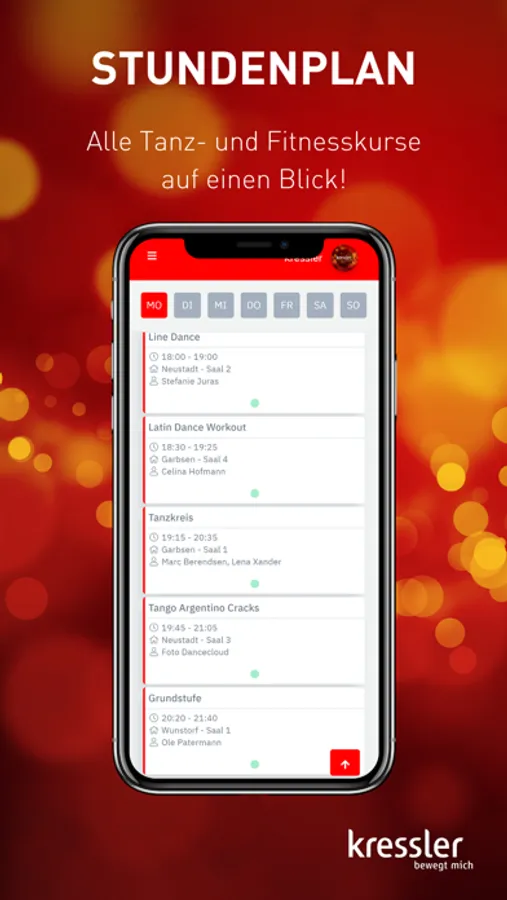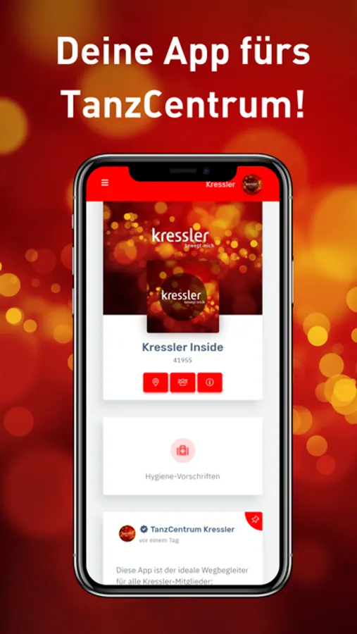 - Verwalte deine Daten, ändere dein Profilbild und behalte jederzeit den Überblick über deine Kressler-Mitgliedschaft. - Plane deine Tanzwoche im Voraus: Im Stundenplan findest du eine tagesaktuelle Übersicht mit allen Kursen, Unterrichtsinhalten und Lehrern. - Du hast deine Kundenkarte oder dein Mitglieds-Armband vergessen? Mit der App, kannst du dich ganz einfach online einchecken. - Verpasse keine Neuigkeiten und lass dich von uns über alle aktuellen Veranstaltungen informieren. Deine Tickets kannst du ganz bequem über die App buchen. - Tanzen und Fitness, wann und wo du willst: Mit unserem Videoportal hast du deine Online-Kurse immer mit dabei. - Kein Tanzpartner? Kein Problem! Lege dir ein Profil in unserer Tanzpartnerbörse an und finde jemanden, der zu dir passt. - Nimm jederzeit Kontakt mit uns auf: Mit der Kressler-App bist du immer nur einen Klick von uns entfernt.
