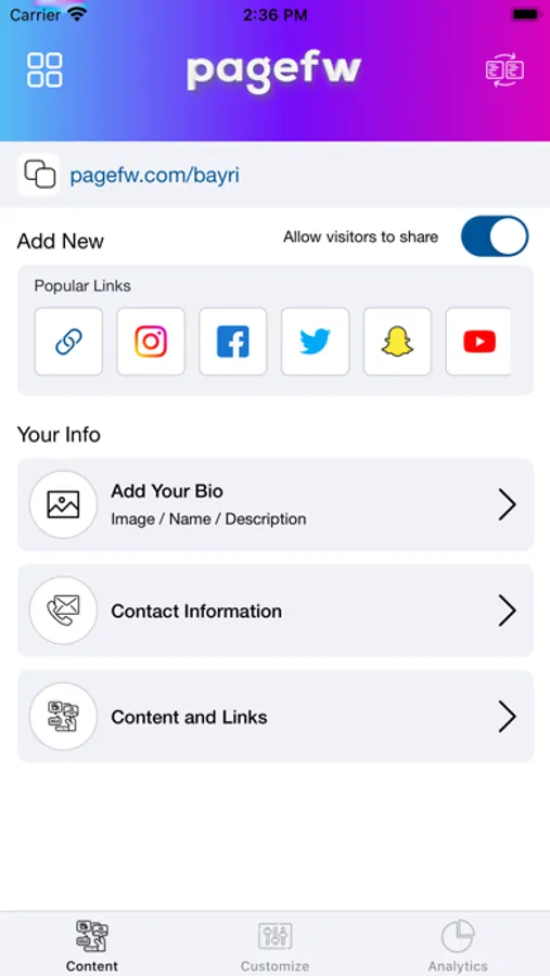 Pagefw is your own personal landing page, making it easy for your friends, fans, customers, or followers to connect with you whenever and wherever. Use it to hold all of your links, social accounts, contact information, and so much more.