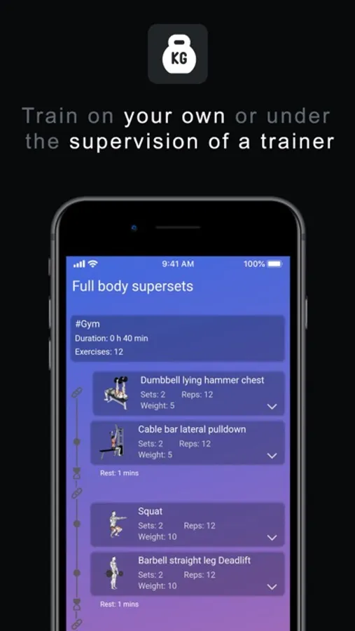 Create a workout plan with your personal trainer, list your personal exercise library and train at home or at the gym.