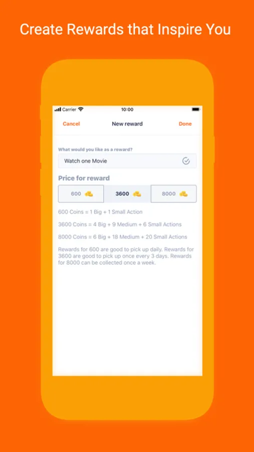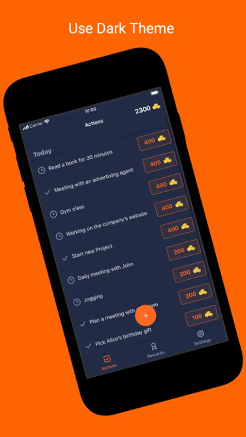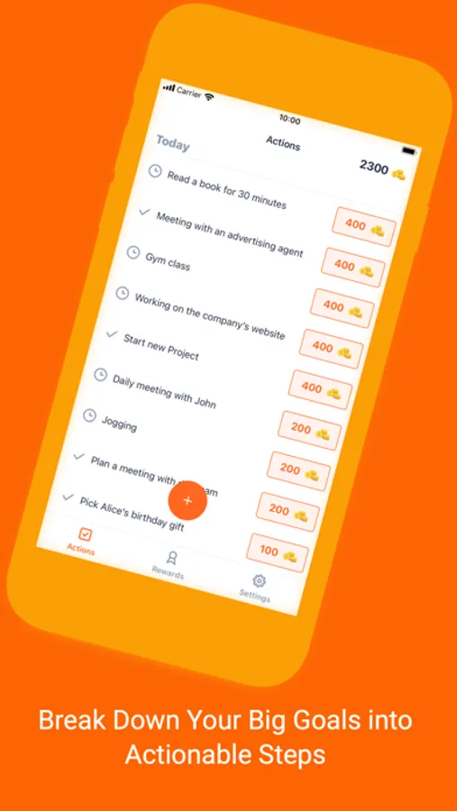 - First, you enter the necessary actions in the list of actions (Clean your house, Read a book for 15 minutes etc.)