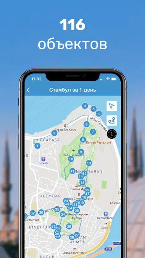Все объекты экскурсий нанесены на удобную встроенную карту центра, работающую даже оффлайн (без интернета), а линия маршрута, GPS-навигация и нумерация объектов позволят легко отыскать путь в лабиринтах городских улочек, даже если Вы посещаете Стамбул впервые.