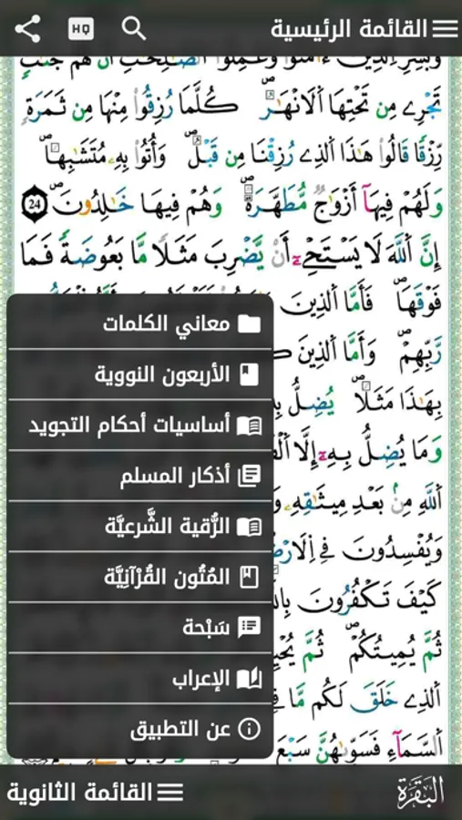 مصحف التجويد الملون برواية ورش عن نافع، صفحاته من إنتاج دار المعرفة صاحبة حقوق الطبعة ، التطبيق سريع جدا ودون إعلانات ويحتوي على الكثير من الميزات نذكر بعضها : الوضع الليلي - الزووم - البحث - التفاسير - الفهارس بجميع أنواعها - الأذكار - المتون - الأربعون النووية - الرقية الشرعية ...) والكثير من الخصائص يمكنكم تجربتها ، لا تنسونا من خالص دعائكم وادعمونا بنشره بين أصدقائكم.