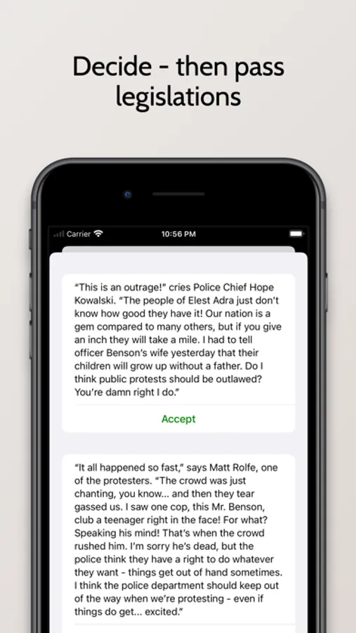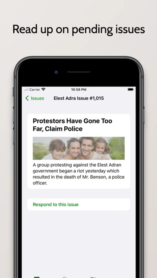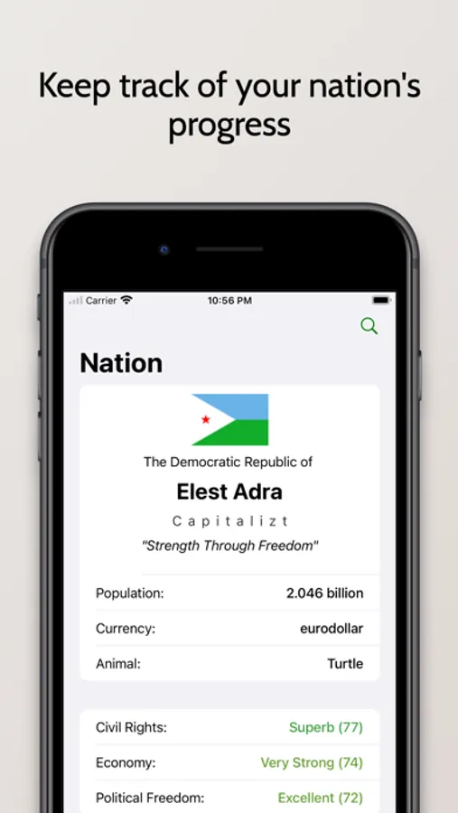Read, decide, and pass legislations according to how you want to build your nation. View past issues and the effects your legislations have had on the rankings of your nation.