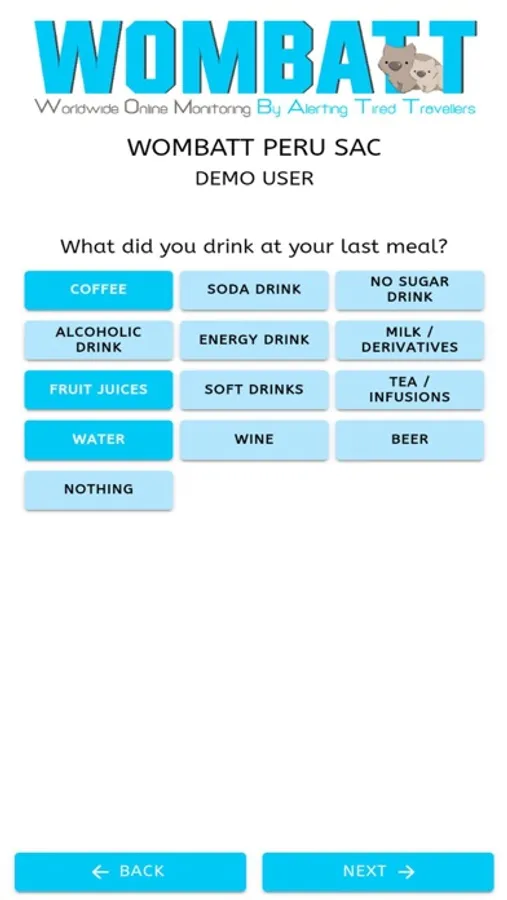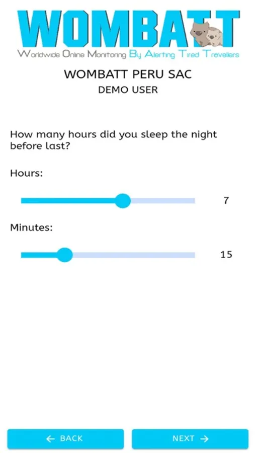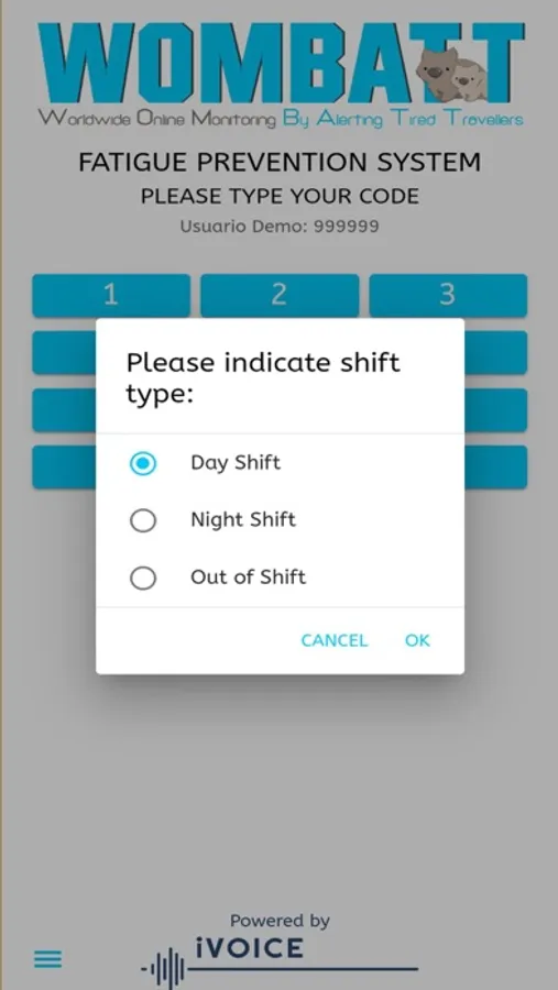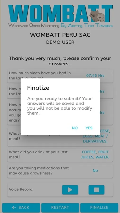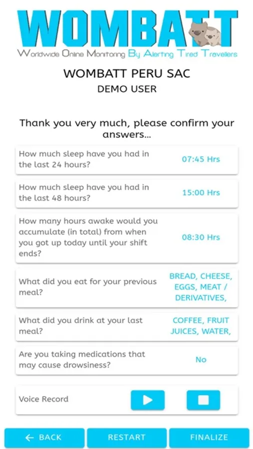The iOS User Interface collects the user's previous sleep, diet and medication information, users are responsible for responding accurately and truthfully to the questions in the questionnaire. Before the pre-shift questions you will read a short text that allows the Interface to record your voice. At the end it will show you a summary of the answers and you will have to send the information to the server in the cloud for the analysis of the answers and the voice. The Interface will receive the information of the results of the analysis and will show it to the user.