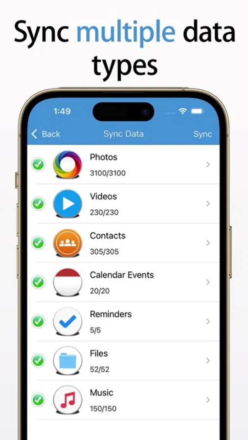 - Support to transfer photos, videos, contacts information, calendar items, reminders, files and music between two devices