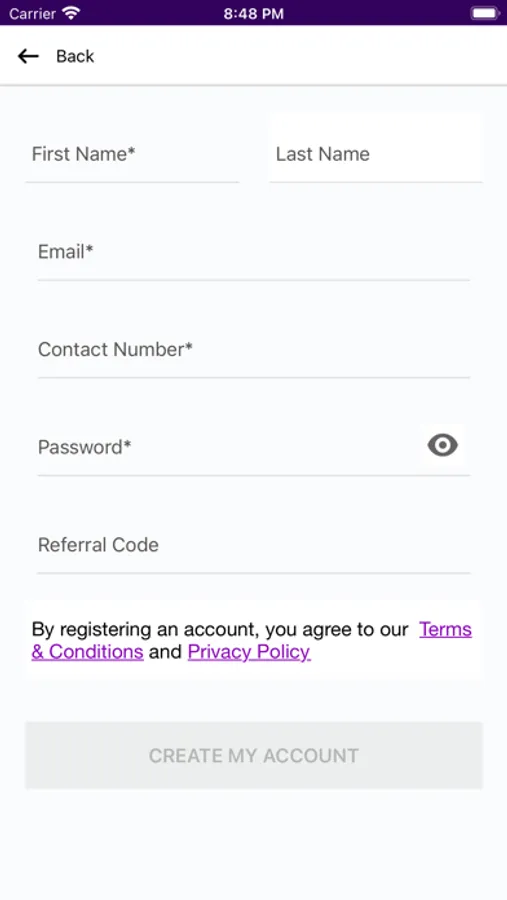 Register an account and verify with an OTP sent to your mobile number. You can paste a referral code if you have one.