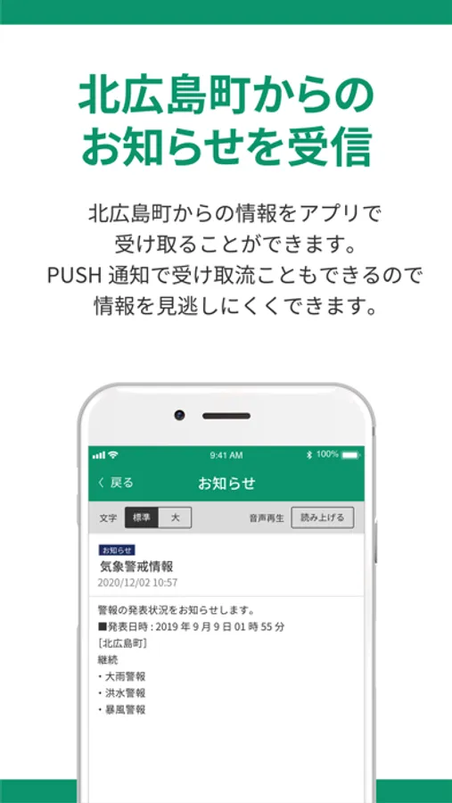 気象情報や地域の情報など、様々な情報をプッシュ通知で受け取ることができます。
