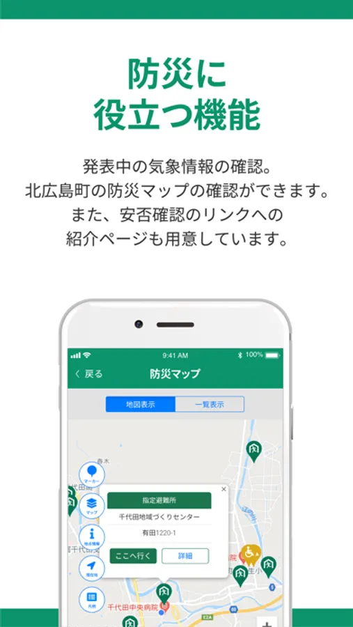 地図上で町内の避難所の位置などを確認できます。また、現在地から避難先までのルートを検索することができ、避難ルートの検討に役立ちます。