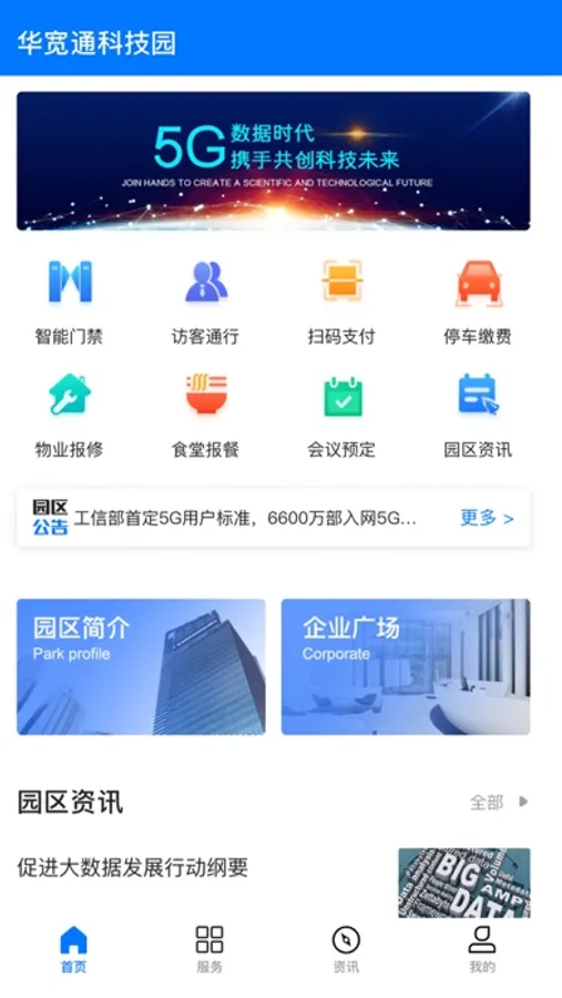 该应用主要有会议预订、物业报修、订餐等功能,同时也可展示新闻资讯,园区动态,园区活动等信息,为园区人员工作,生活,学习等提供全方位一体化的美好体验。