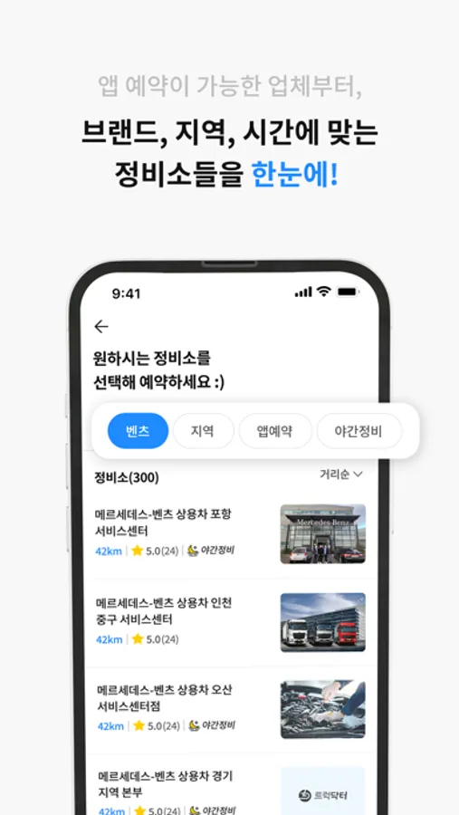 야간 정비가 가능한 정비소를 선택할 수 있습니다.