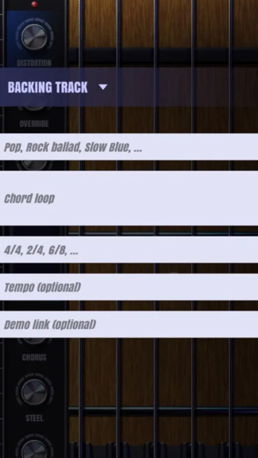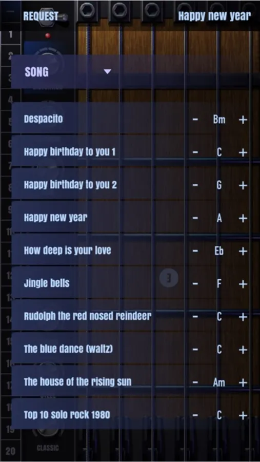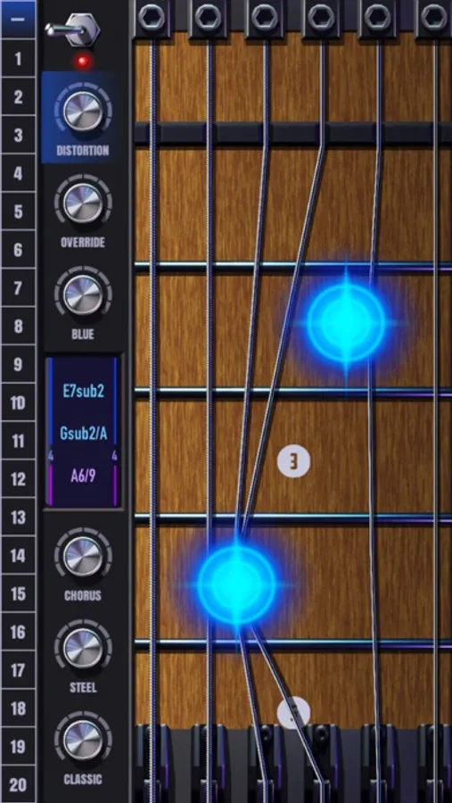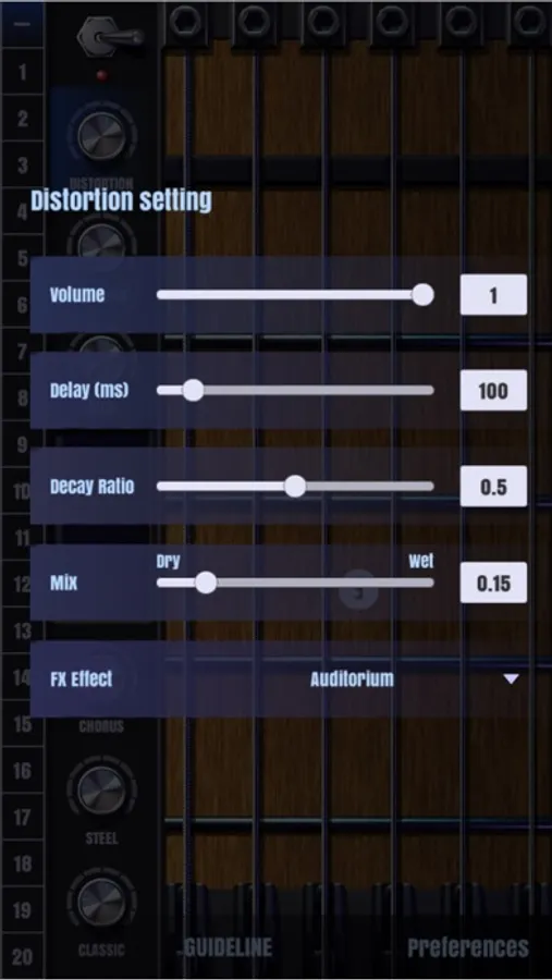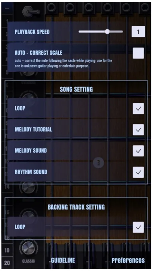 1. Choose sound-font: the sound of specific guitar will be chose as Classic, Steel, Chorus, Blue, Override, and Distortion.