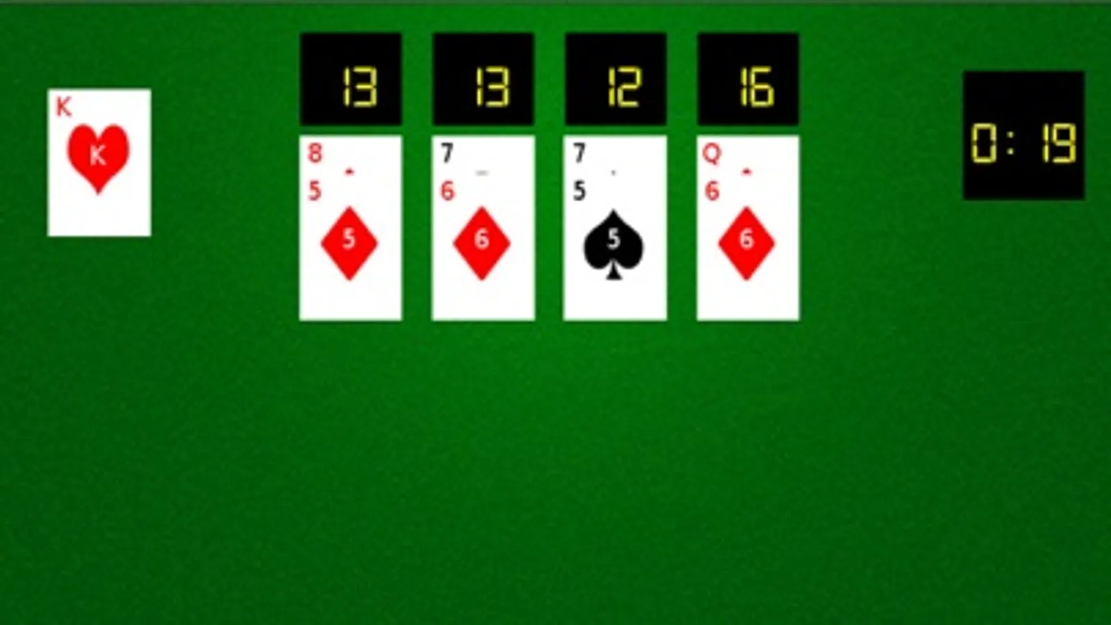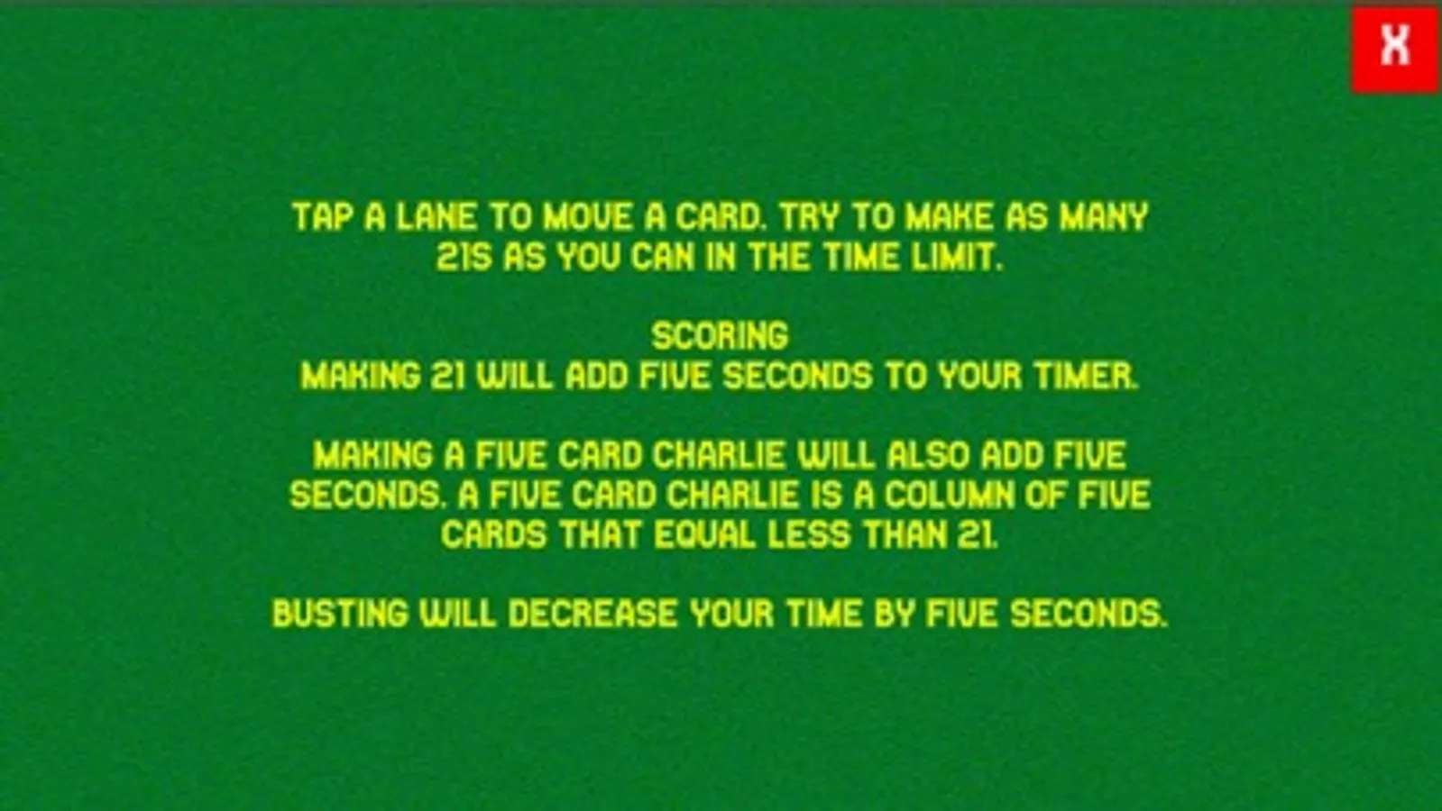 21 Turbo Blitz is a game of chance and strategy. Make 21 in any column to increase your timer by 5 seconds. Beware, if you bust, you will lose five seconds! Keep going as long as you can and see if you can't beat your own best time!