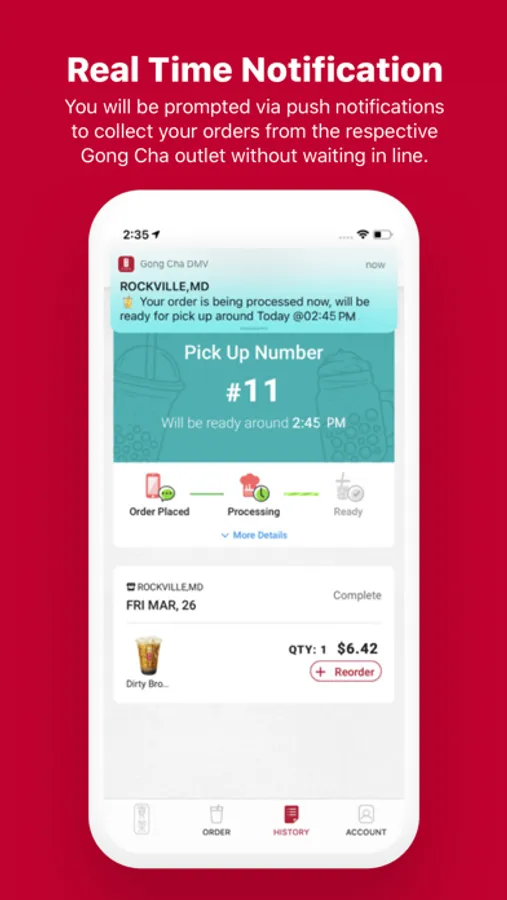 You will be prompted via push notifications to collect your orders from the respective GongCha outlet without waiting in line.