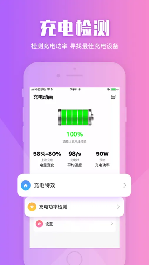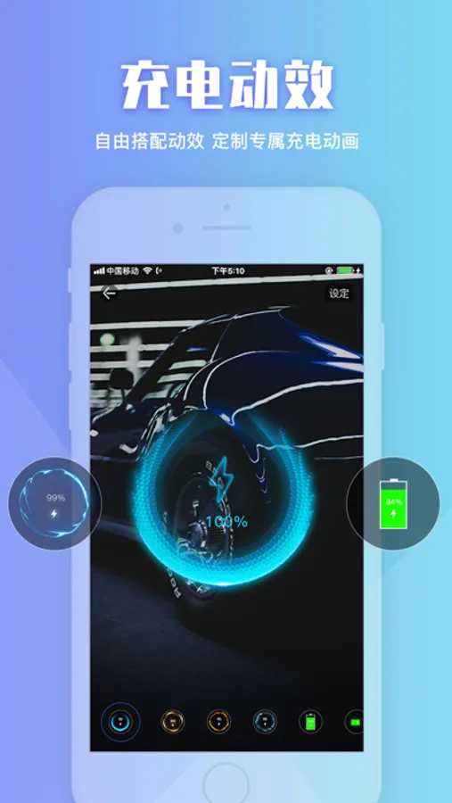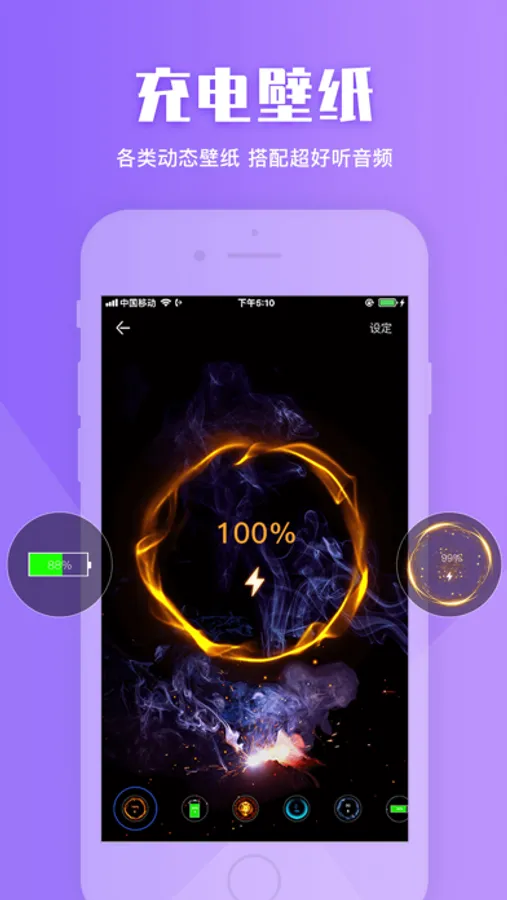 当插上数据线时,可以呈现与众不同的动画效果;还可以设置充电背景壁纸;