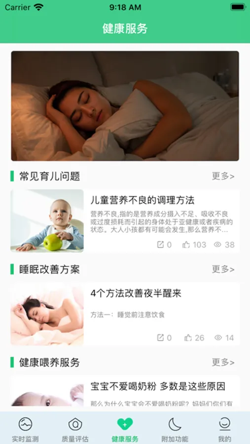 APP功能描述:展现用户睡眠质量分期报告,提供健康建议如常见育儿问题、睡眠改善方案、健康喂养服务以及睡眠交流论坛等。