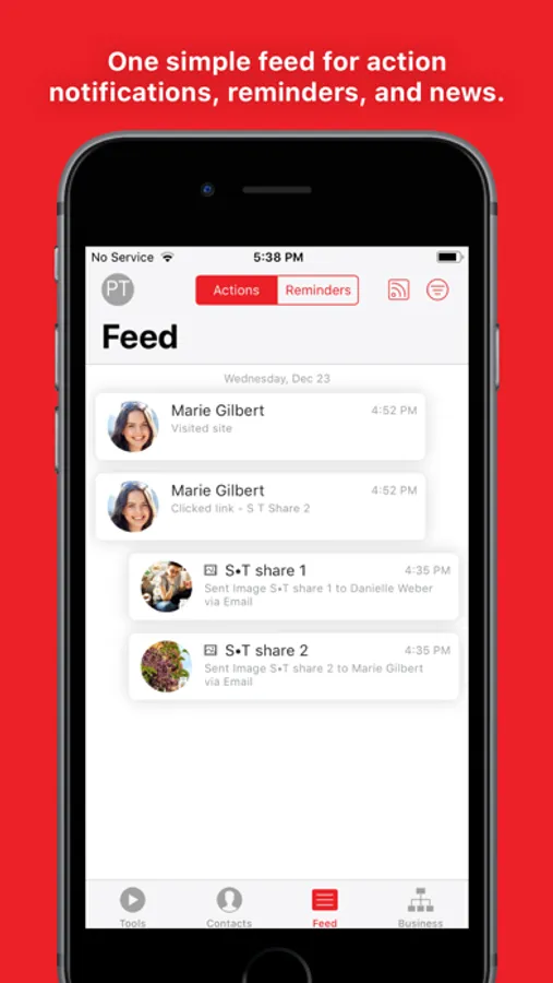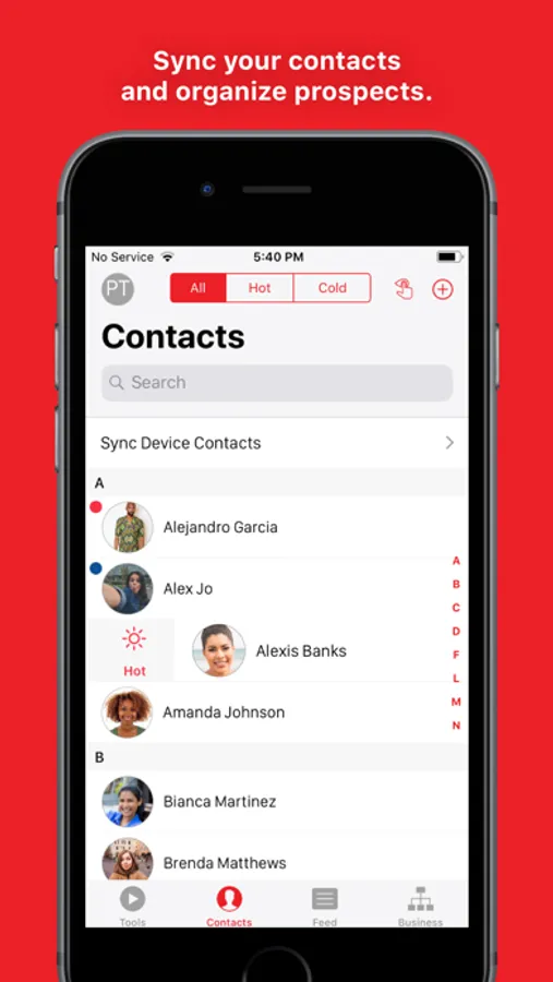 Contacts: Choose how to sync and manage your contacts. Swipe to sort them by interest level. You can make connections, add notes, or check out the Contact Feed to see the tools you’ve shared and contact actions.