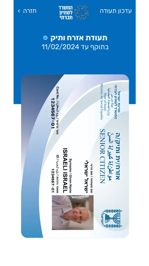 * לקבל תעודת אזרח ותיק דיגיטלית עם תמונה, שתוצג בטלפון הנייד מתוך האפליקציה (בנוסף לתעודה הקשיחה