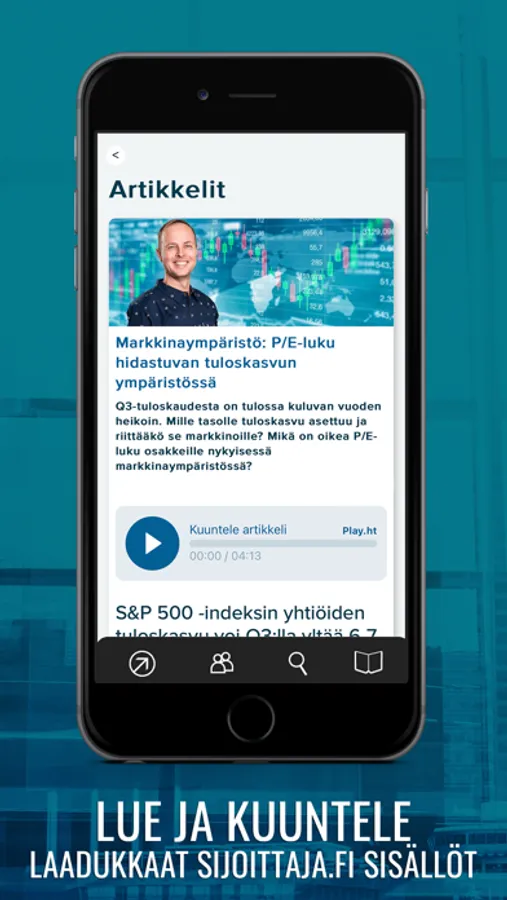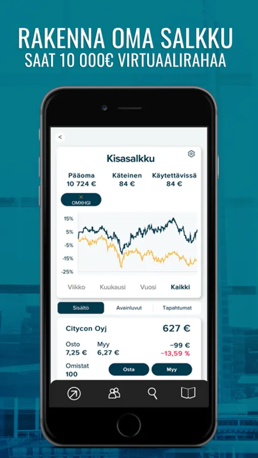 Rakenna oma virtuaalinen osakesalkku Helsingin pörssin osakkeista, hyödynnä kattavia sijoitusartikkeleita ja voita palkintoja sijoituskilpailuissa! Kattavien sijoitusartikkelien avulla on helppo pysyä markkinan käänteissä mukana sekä etsiä ideoita omaan sijoitussalkkuun. Pääset kisaamaan muiden käyttäjien kanssa sovelluksessa järjestettävissä sijoituskilpailuissa, joissa parhaat osakepoimijat palkitaan.