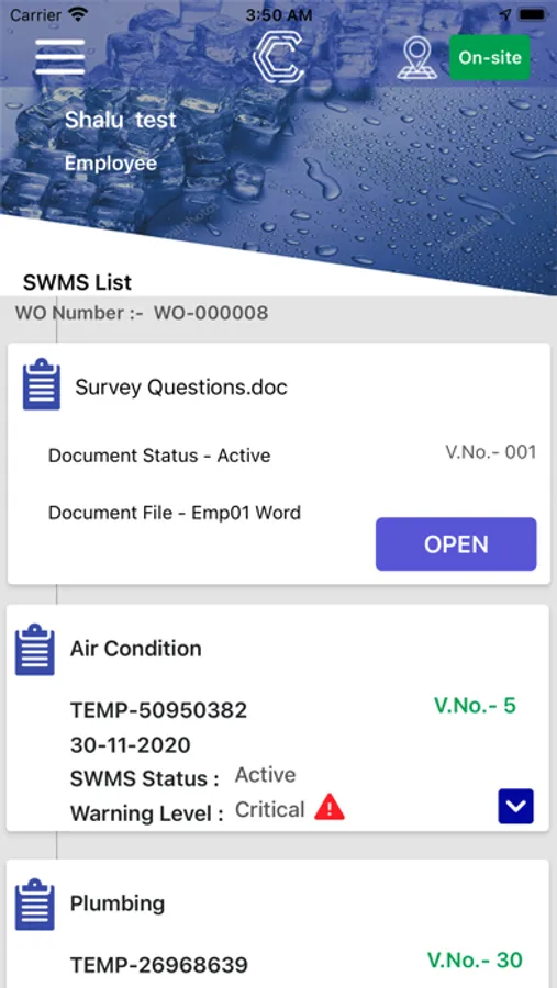 The Admin user for the organisation can create and customise these work based Risk Assessments, attach procedural documents and/or create and attach a survey and then assign these to individual or a group of employees for completion. The employees can login to the app once they are registered by their Company Admin user.