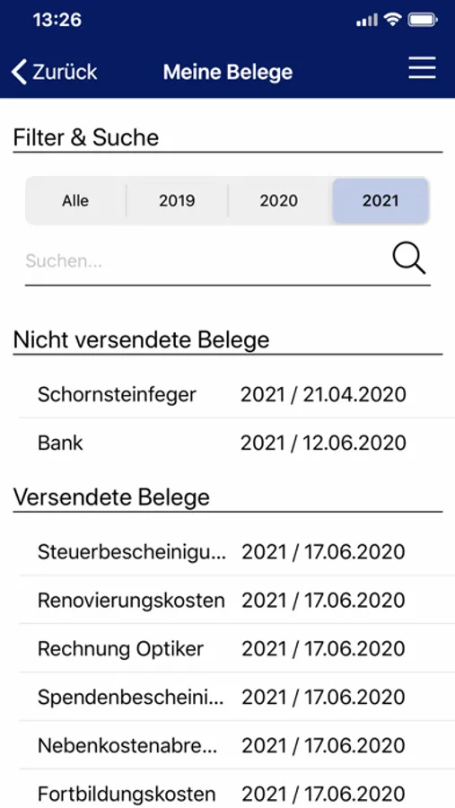 Darüber hinaus bietet die App eine Übersicht Ihrer versendeten und nicht versendeten Belege mit jahresspezifischer Filterfunktion und einer Volltextsuche.