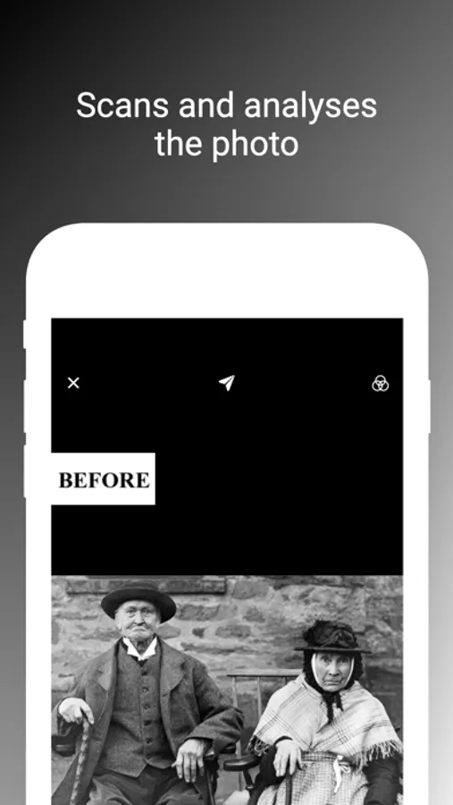 Select photo → AI colorization starts automatically → COLORIZED → Apply filter (optional) → Save or share